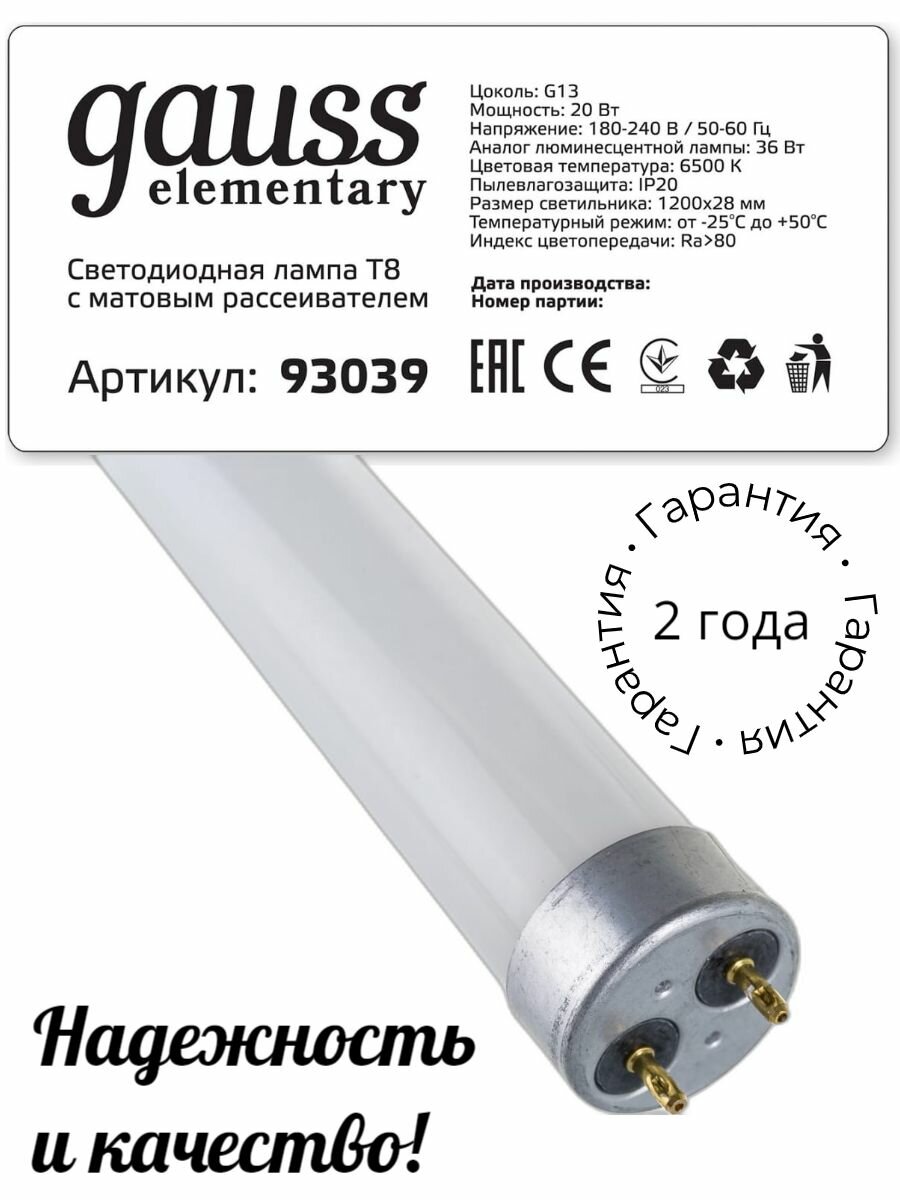 Ниже Вы можете прочитать отзывы на Лампа светодиодная Elementary 20Вт трубчатая 6500К холод. бел. G13 1600лм стекло GAUSS 93039, ознакомится с подробными характеристиками, посмотреть интересные обзоры и фотографии на Лампа светодиодная Elementary 20Вт трубчатая 6500К холод. бел. G13 1600лм стекло GAUSS 93039.