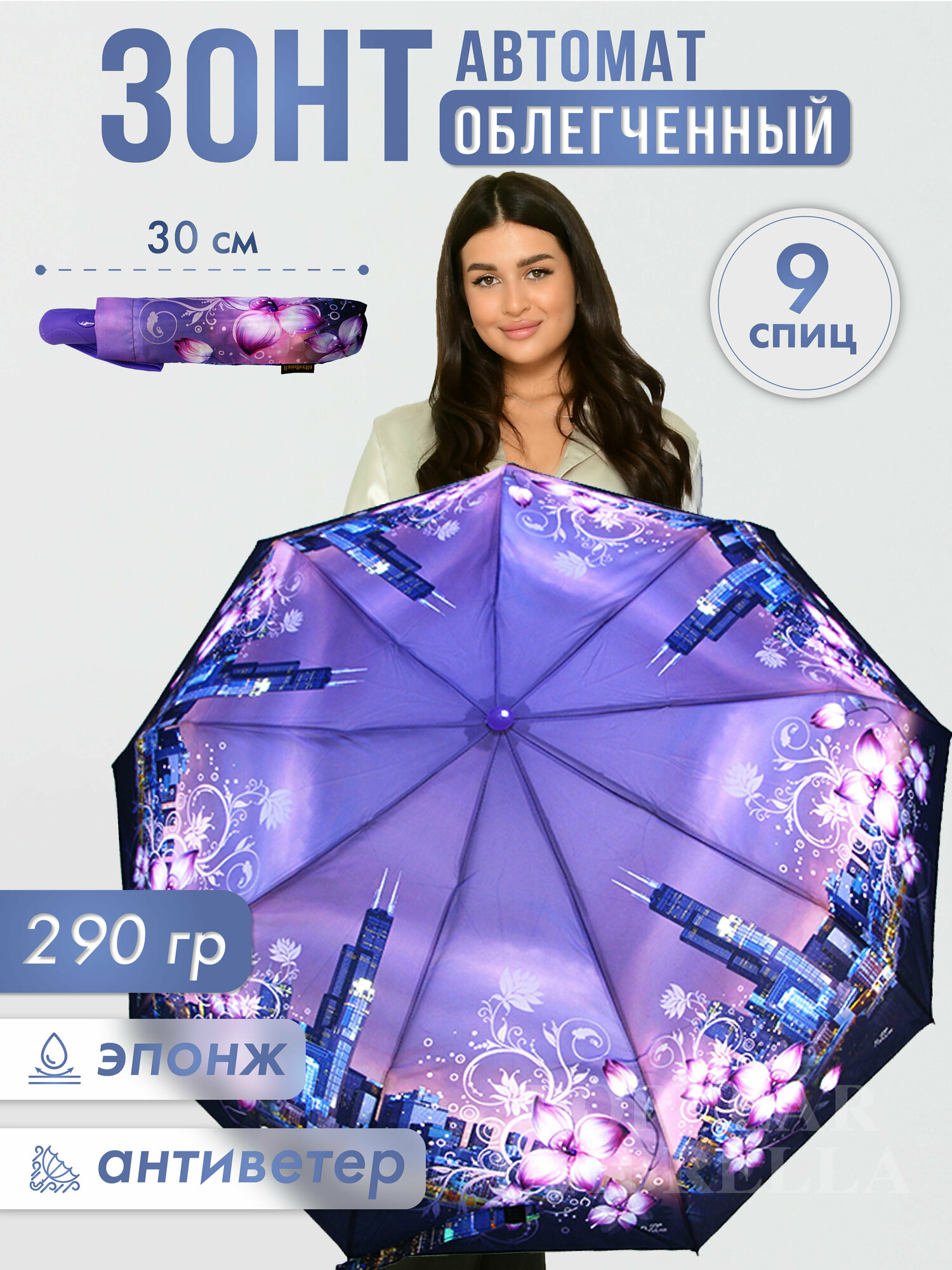 СохранитьЗонт женский автомат, зонтик взрослый складной антиветер 111D-9, серо-голубой,сиреневый интересное: