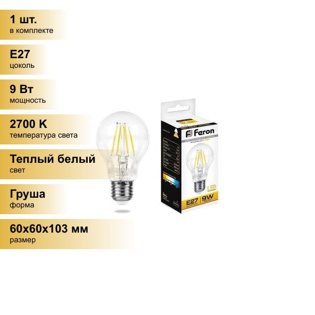 Feron LB-63 Лампа светодиодная филамент, A60 (шар), 9W 230V E27 2700К 1 шт.