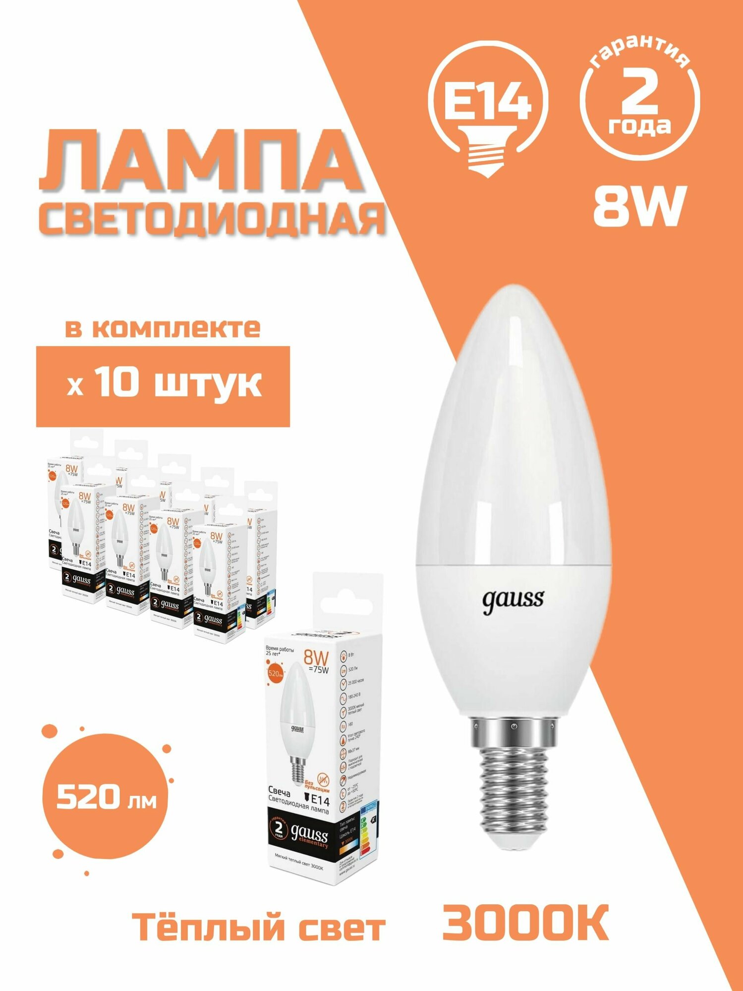 Упаковка ламп LED GAUSS E14, свеча, 8Вт, 3000К, белый теплый, 10 шт. [33118]