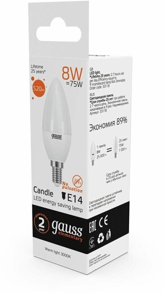 СохранитьЛампа светодиодная Gauss Elementary 8Вт цоколь: E14 свеча 220B 3000K цвет свечения белый теплый С35 (упаковка: 10 штук) (33118) интересное: