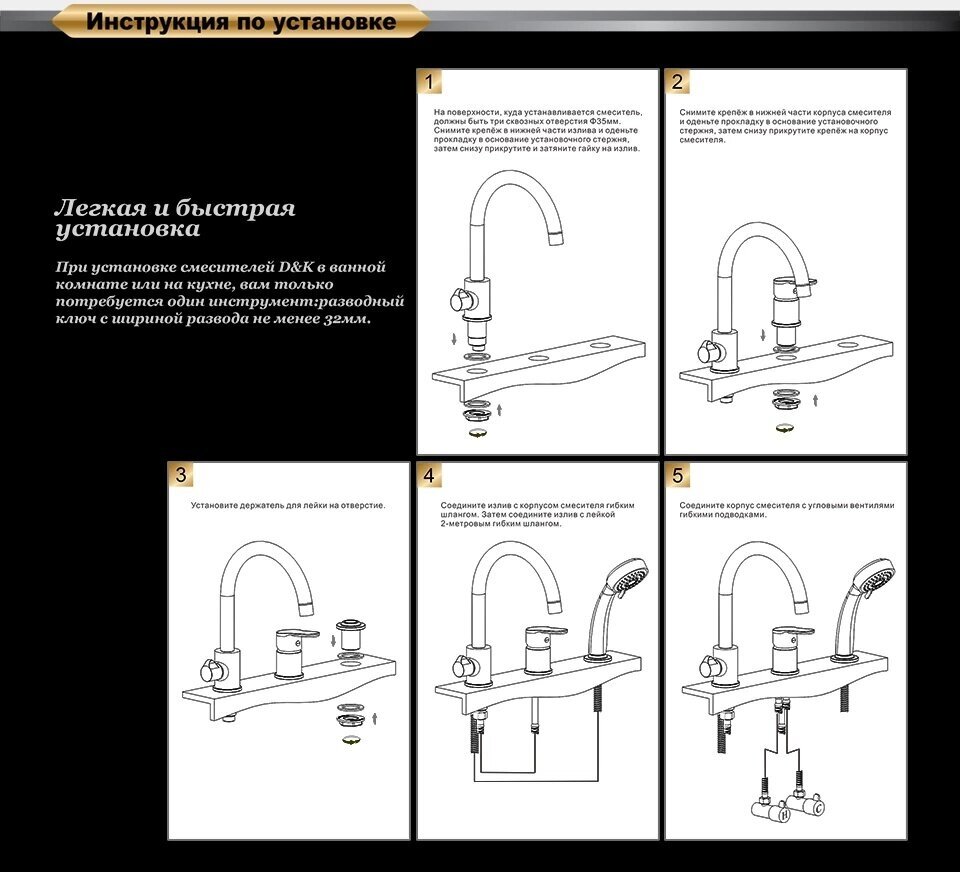 | Комплектация | излив с переключателем-дивертором - 1 шт. / блок смешивания - 1 шт. / соединительный шланг - 1 шт. / душевая лейка - 1 шт. / душевой шланг - 1 шт. / инструкция - 1 шт. / гарантийный талон - 1 шт. |