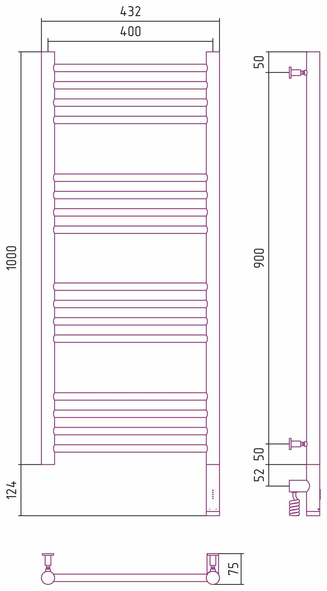 Полотенцесушитель электрический Сунержа 31-5805-1040 Богема 3.0 Полотенцесушитель электрический РЭБ, прямая, 1000х400 мм/ МЭМ правый, матовый черный