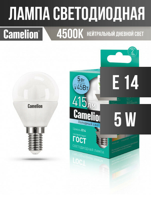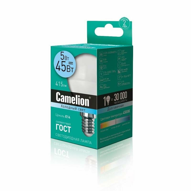 Купить Лампа светодиодная E14, 5 Вт, 45 Вт, шар, 4500 К, свет холодный белый, Camelion
