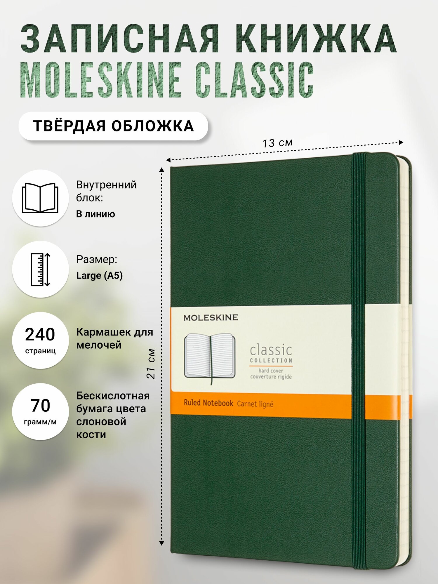 Блокнот Moleskine CLASSIC Large 130х210мм 240стр. линейка твердая обложка зеленый