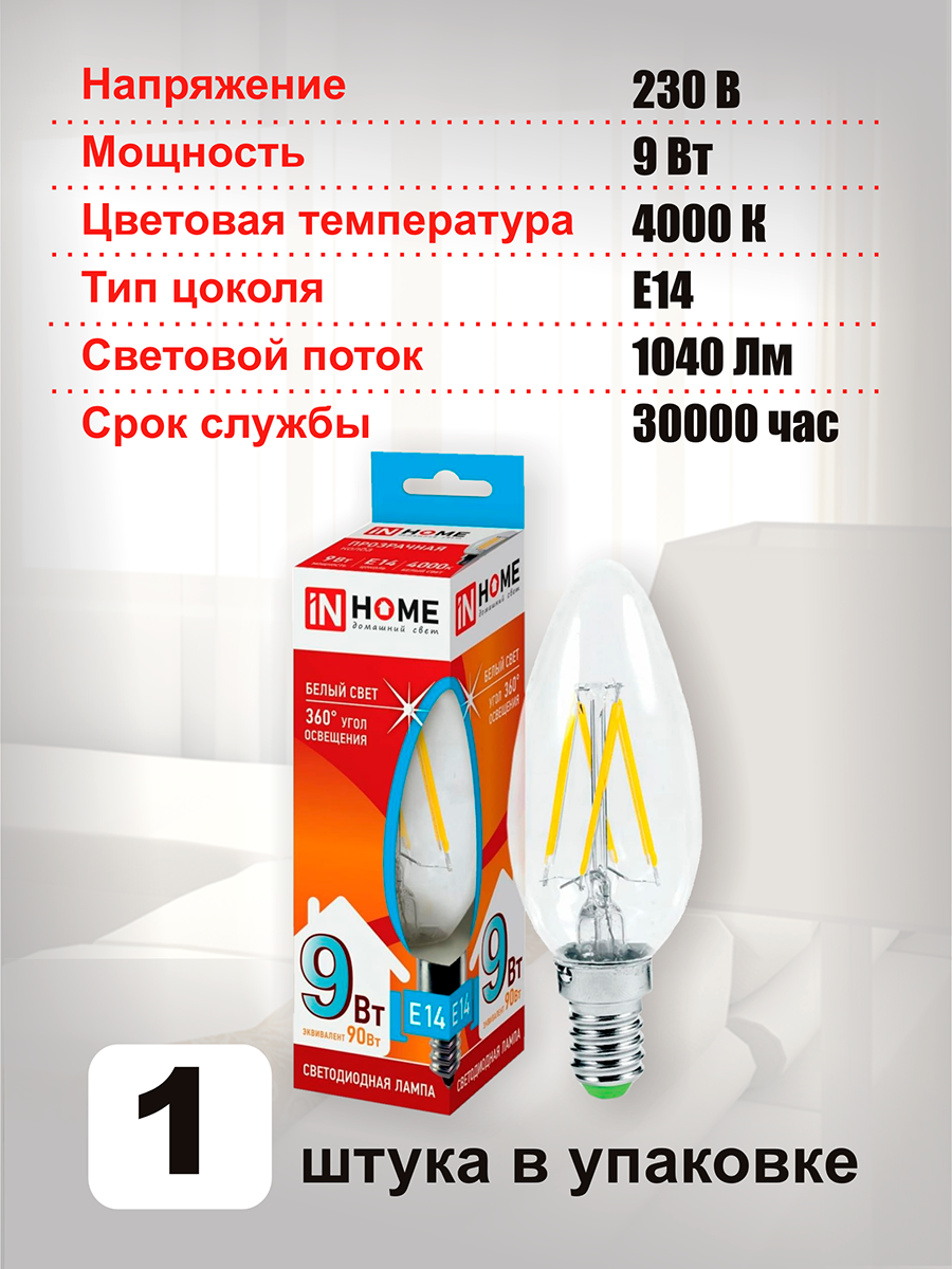 Лампа светодиодная филаментная лампочка LED-СВЕЧА-deco, 9Вт, 230В Е14 4000К 1040Лм, прозрачная, IN HOME (4690612026206)