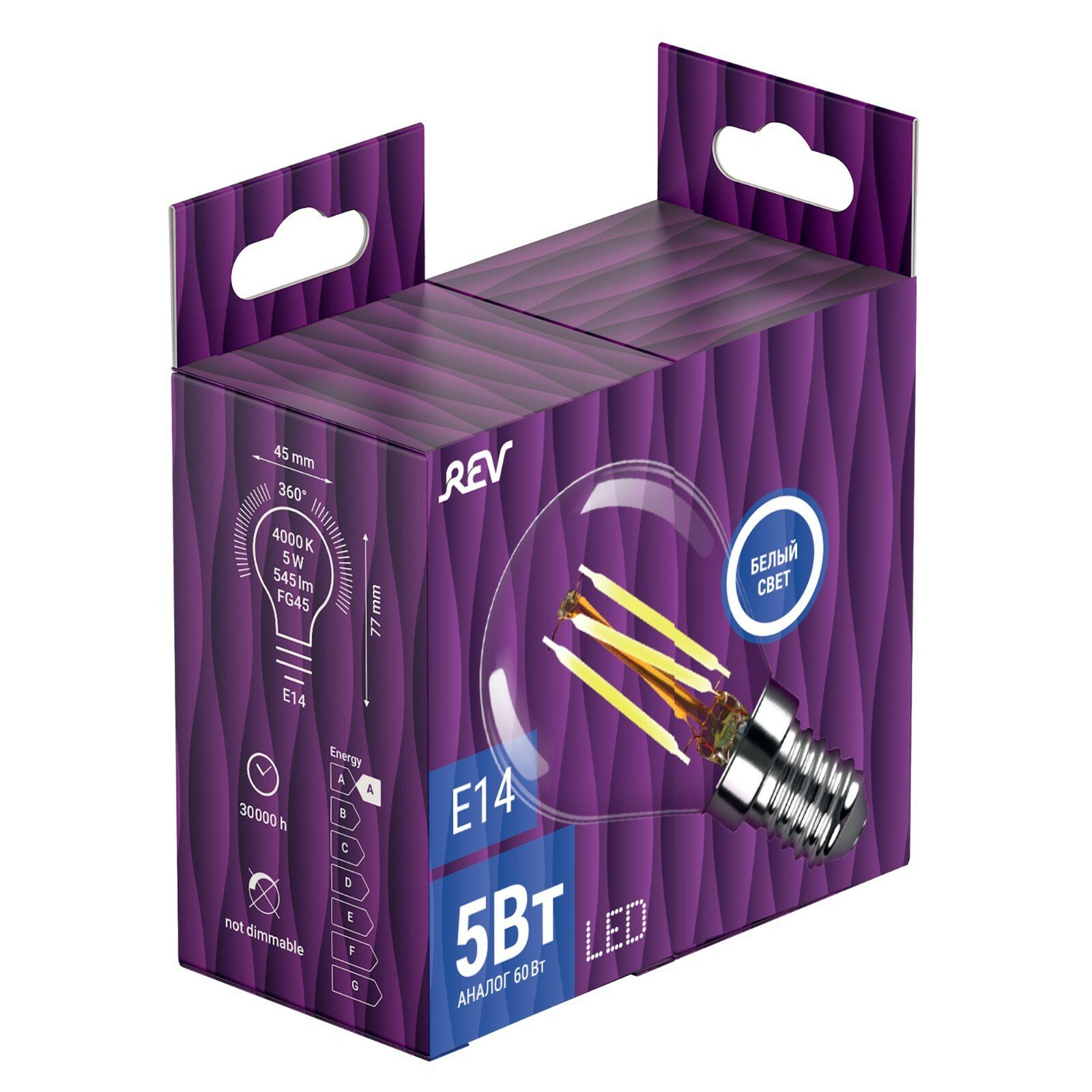 Купить Лампа filament, шар, G45, белый свет, 5Вт, E14, 4000K, 545Лм, 32358 7, REV