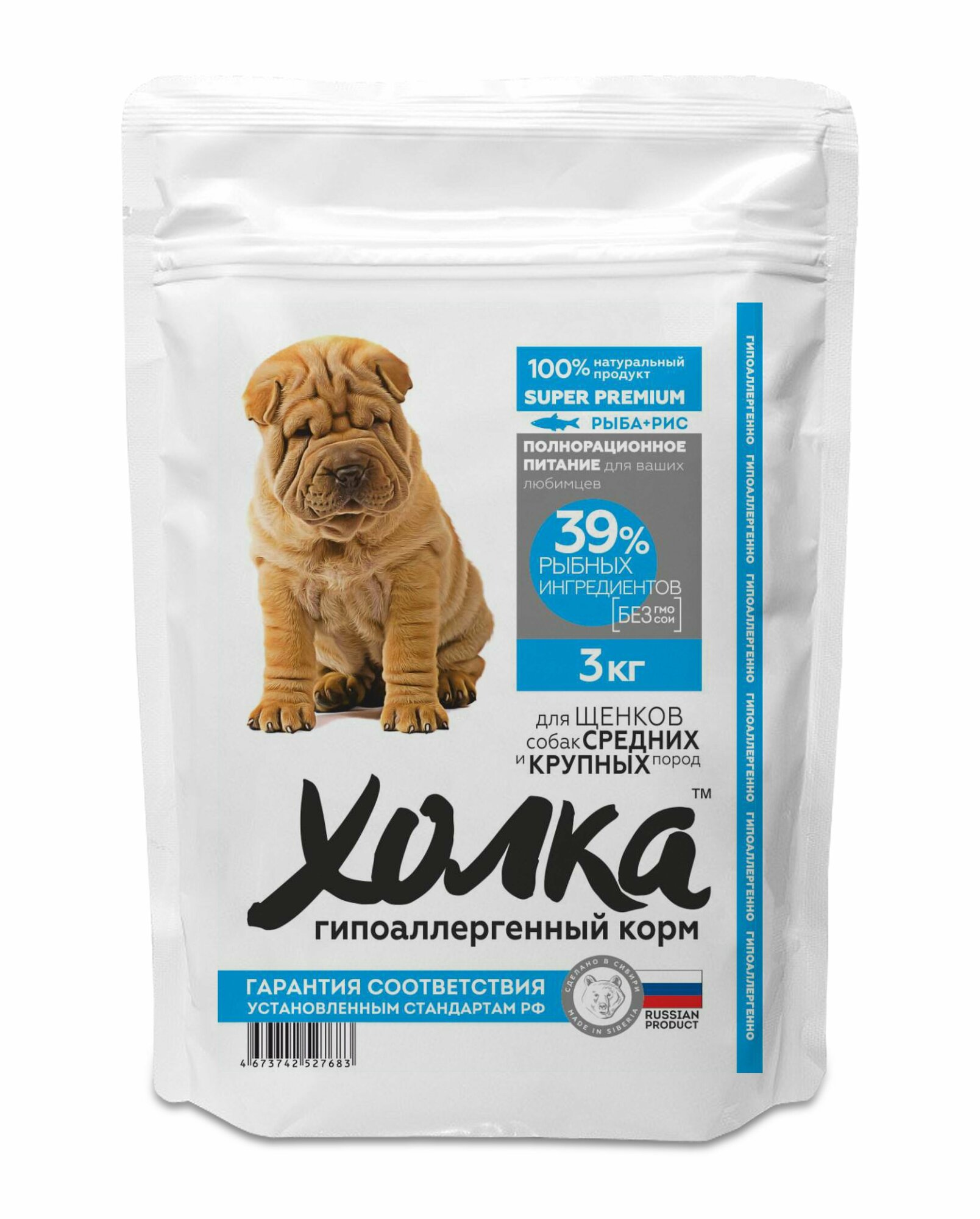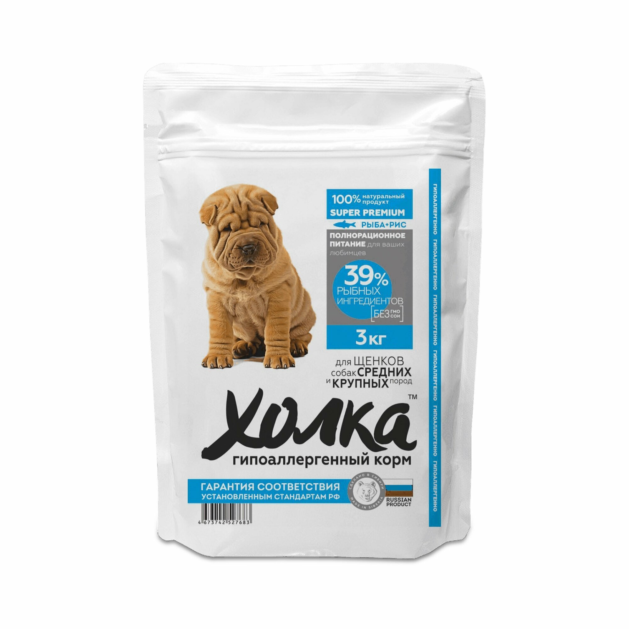 Гипоаллергенный сухой корм для щенков средних и крупных пород, рыба и рис, Холка 3 кг