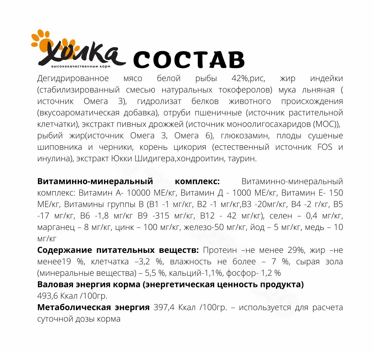 | Состав | дегидрированное мясо белой рыбы 39%, рис, жир индейки (стабилизированный смесью натуральным токоферолов), мука льняная (источник Омега 3), гидролизат белков животного происхождения (вкусоароматическая добавка), отруби пшеничные (источник растительная клетчатка), экстракт пивных дрожжей (источник моноолигосахариды (МОС)), рыбий жир (источник Омега 3, Омега 6), глюкозамин, плоды сушеные шиповника и черники, корень цикория (естественный источник FOS и инулина), экстракт Юкки Шидигера, хондроитин, таурин |