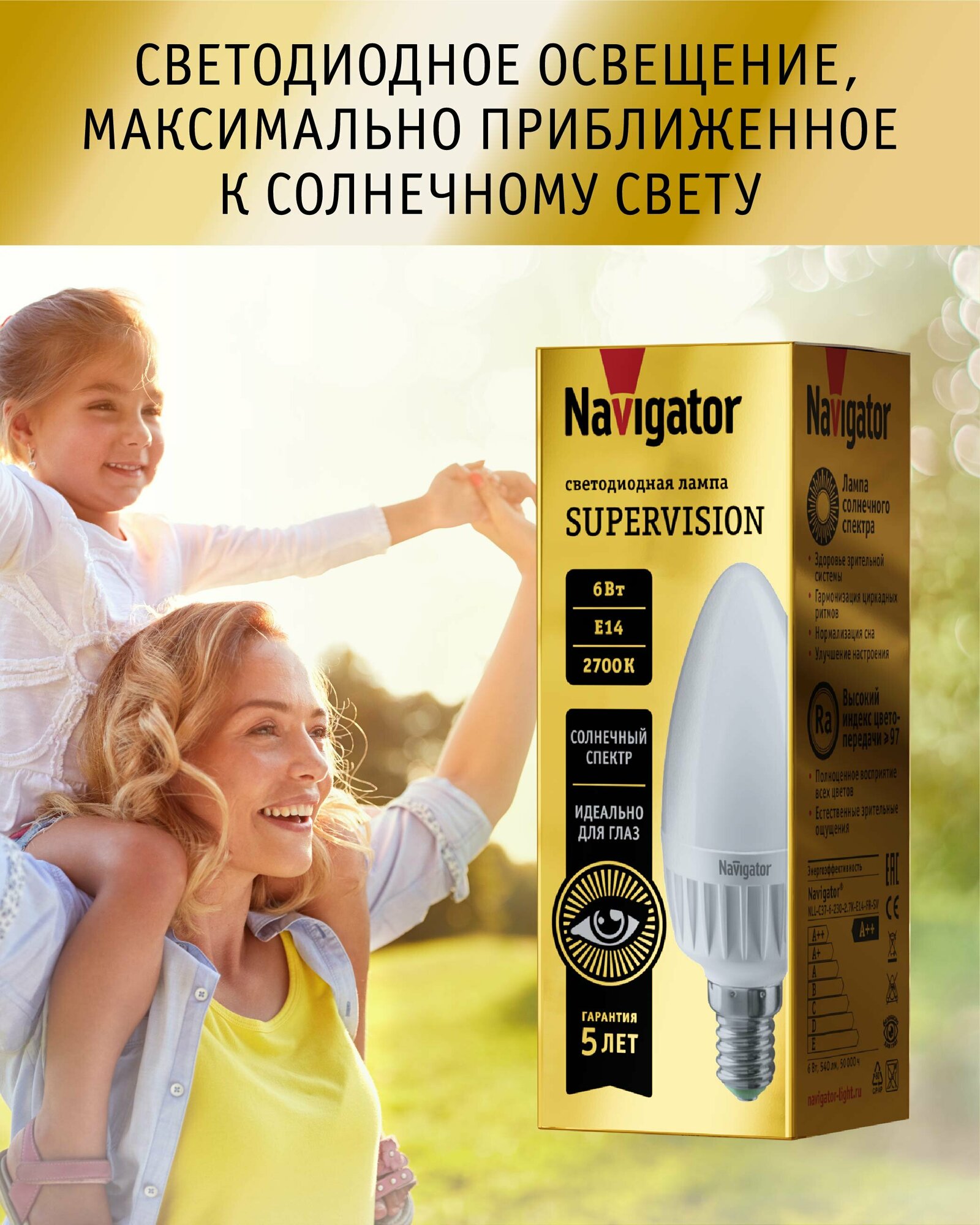Лампа светодиодная солнечного спектра Navigator 80 545 Supervision, свеча, 6 Вт, E14, теплого света 2700К, 1 шт.