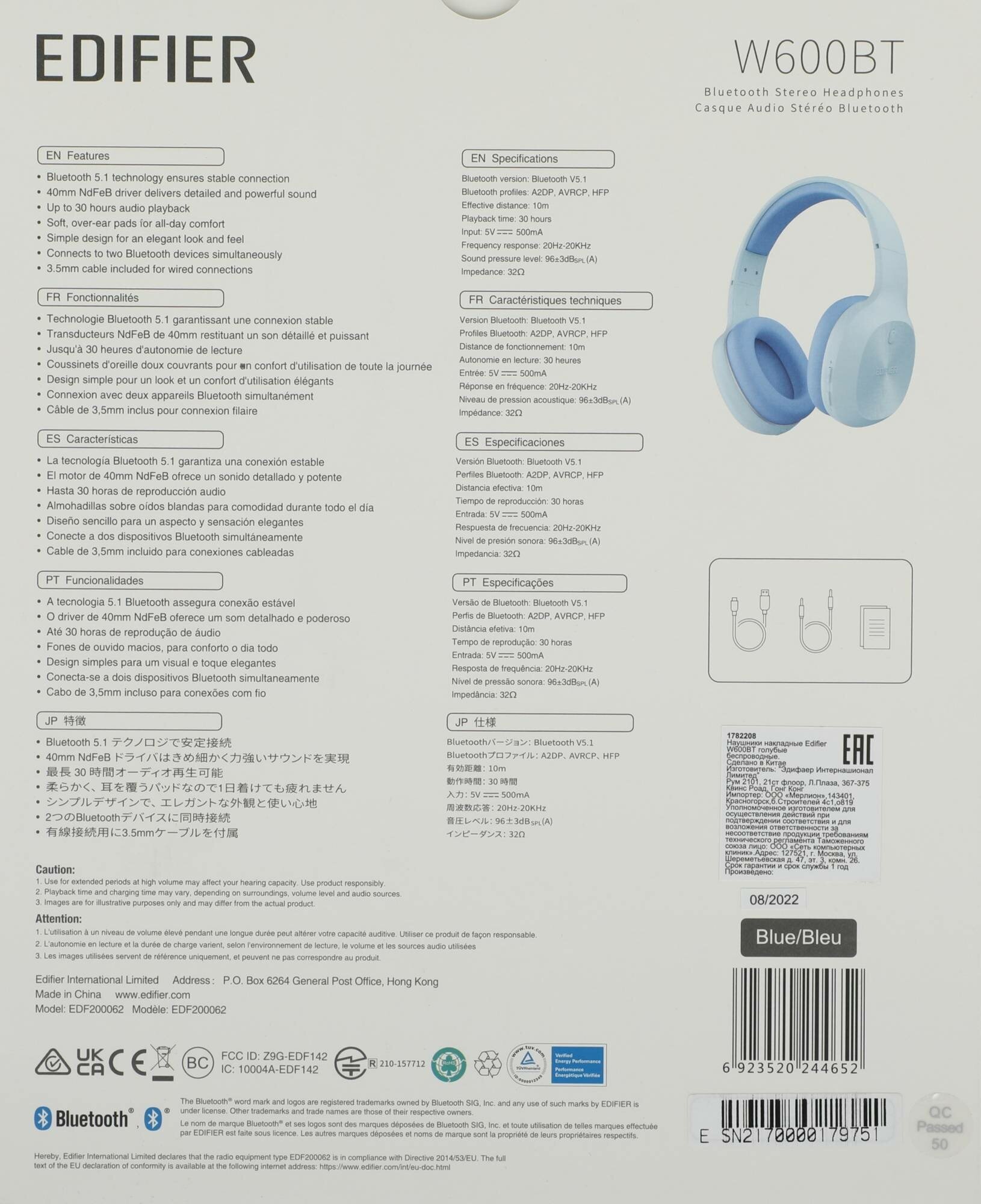 Наушники Edifier W600BT, 3.5 мм/Bluetooth, накладные, синий интересное: