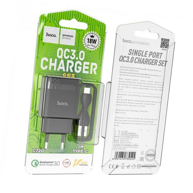 Сетевое зарядное устройство Hoco C72Q Glorious, 18W + кабель USB Type-C, черный