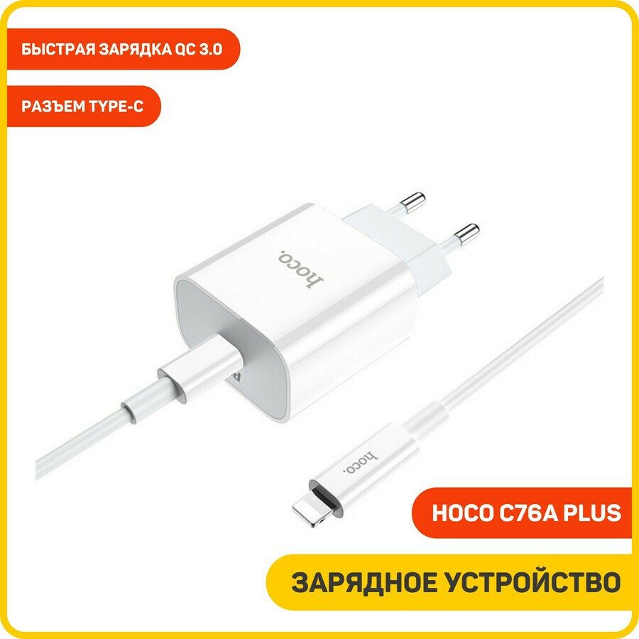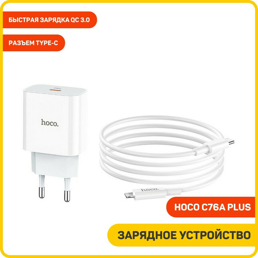 Сетевое зарядное устройство (СЗУ) Hoco C76A Plus (Type-C) + кабель Type-C-Lightning, 3 А, белый