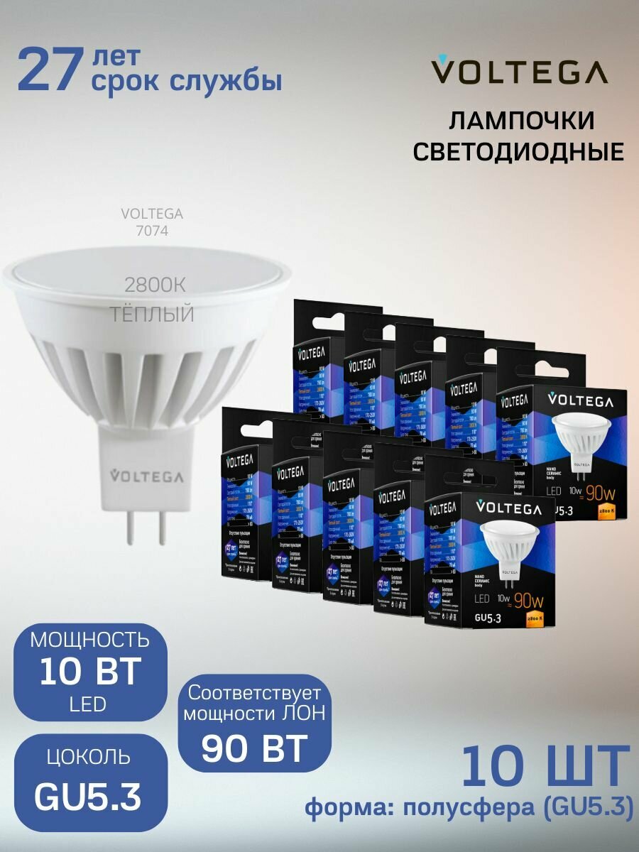 Лампочка светодиодная GU5.3 форма cофит 10W теплый свет Voltega Сeramics MR16 2800K упаковка 6 штук