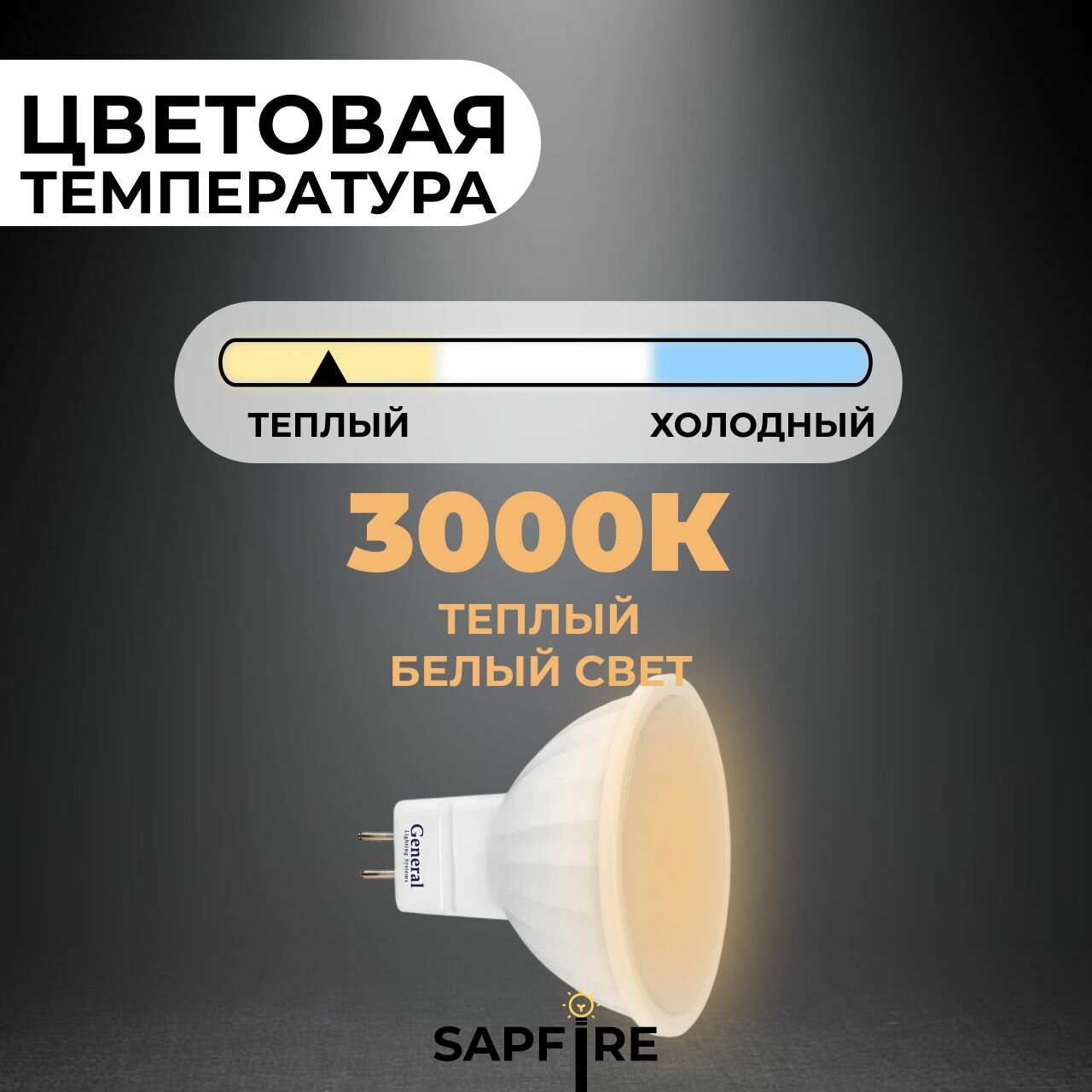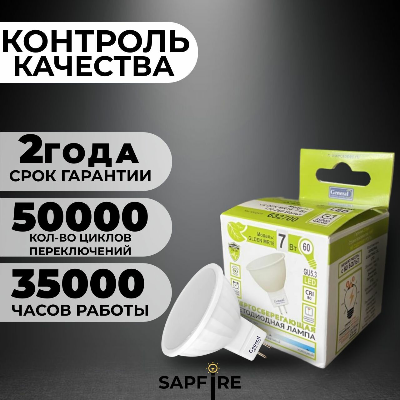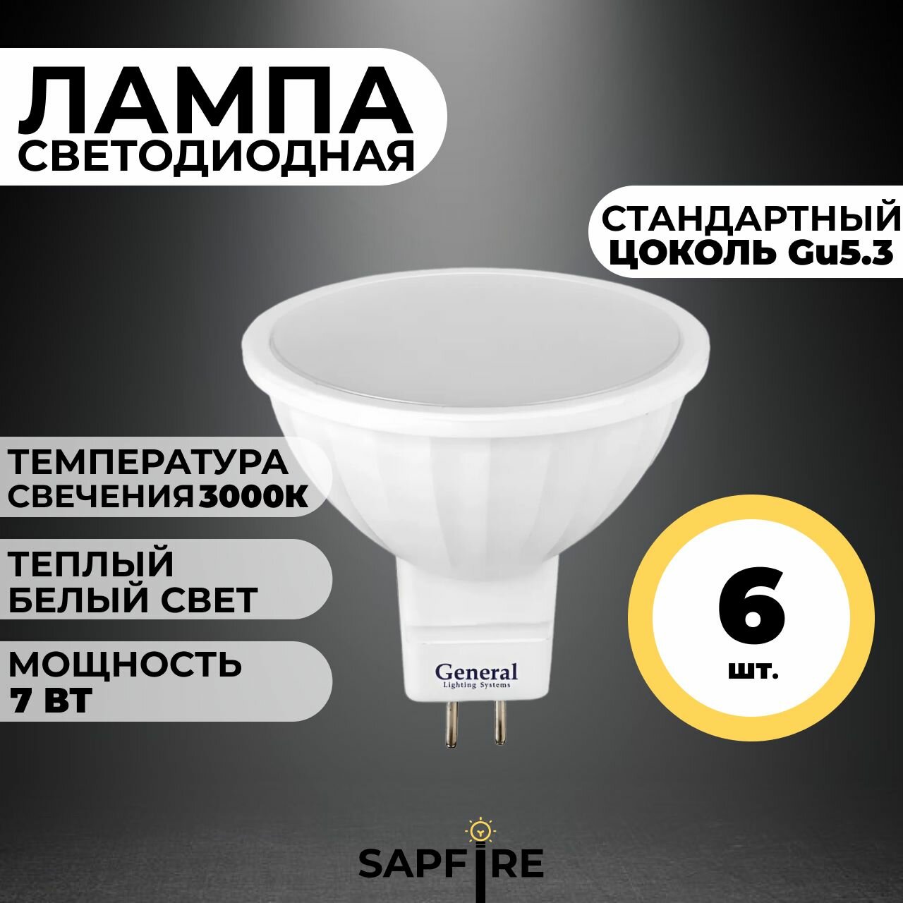 General MR16 GU5.3 7W(450lm) 3000K 2K 50x50 пластик/алюм 632700, Лампа светодиодная