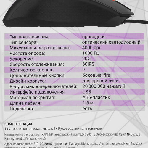 Мышь компьютерная HIPER DRACO, черная, 9 кнопок, 4000 dpi, RGB подсветка