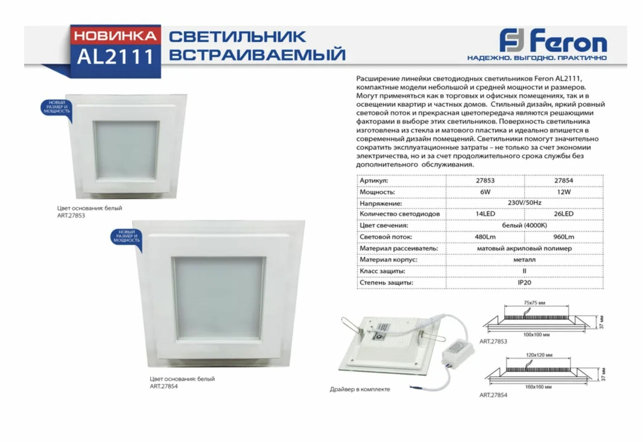 Ниже Вы можете прочитать отзывы на Встраиваемый светодиодный светильник Feron AL2111 27854, ознакомится с подробными характеристиками, посмотреть интересные обзоры и фотографии на Встраиваемый светодиодный светильник Feron AL2111 27854.