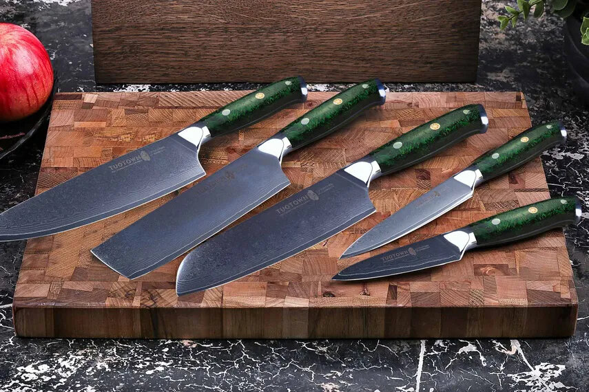 Японский кухонный нож Накири TuoTown G617006, рукоять - композит зеленый перламутр, клинок 17см (VG10-Damascus). интересное: