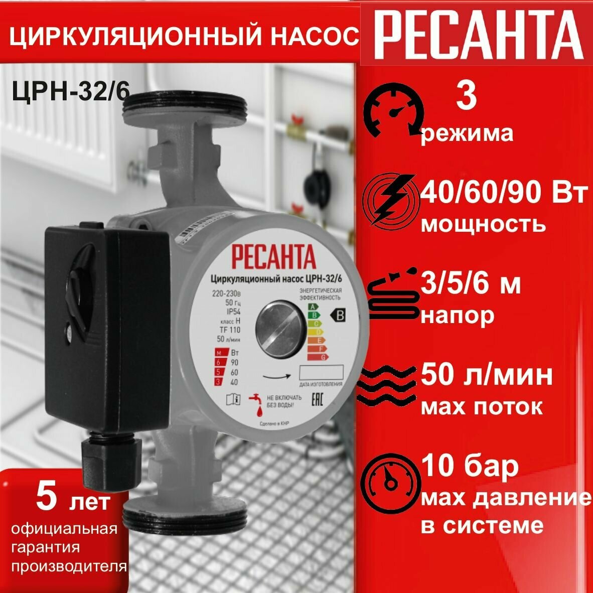 Циркуляционный насос ЦРН-32/6 Ресанта (90 Вт, напор - 6 м, 3 режима) для системы отопления и теплого пола, для дома и дачи