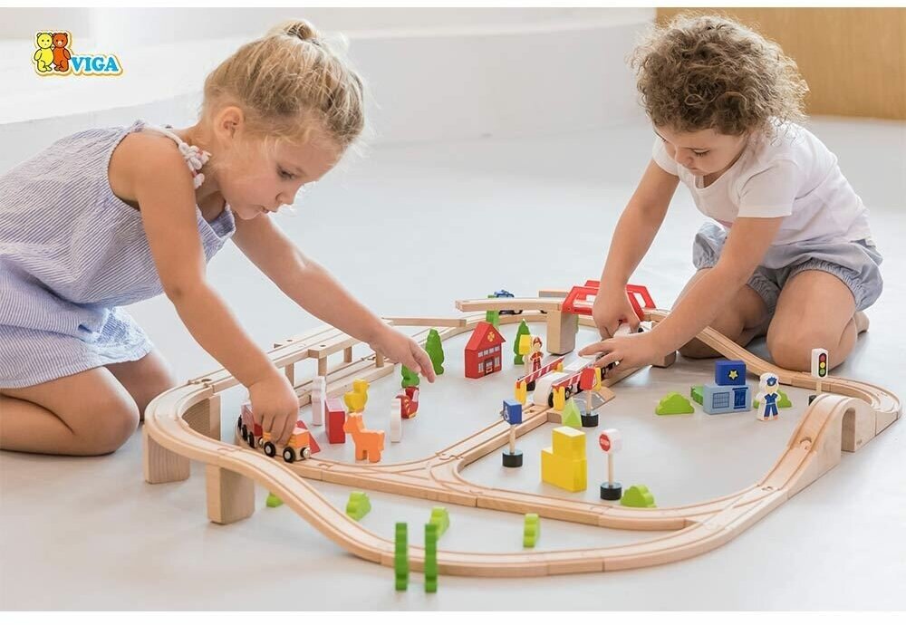 Развивающие игрушки из дерева Viga Toys Деревянная железная дорога 90 деталей