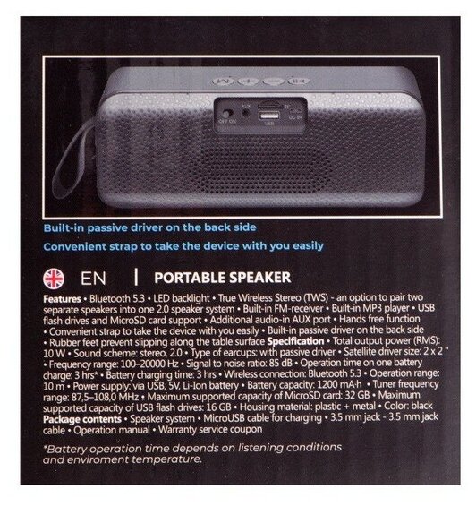 | Особенности | FM-радио / встроенный микрофон (функция HandsFree) / поддержка microSD / Встроенный FM-приемник. Встроенный тюнер превращает колонку в полноценный радиоприемник. Вы всегда сможете послушать ваши любимые радиопередачи или музыку. |