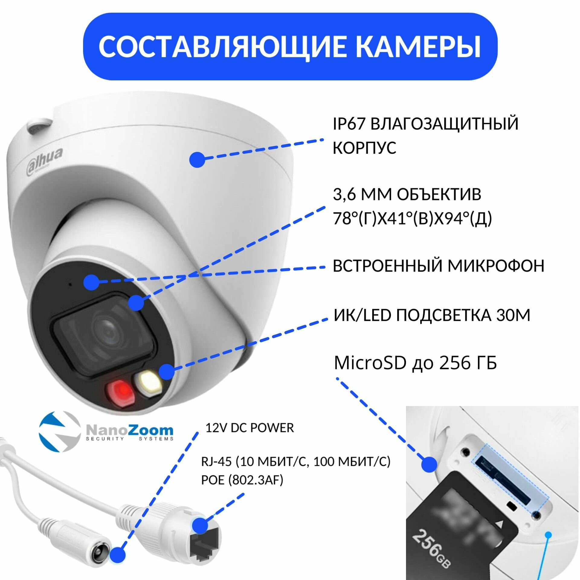 Dahua DH-IPC-HDW2249TP-S-IL-0280B 2Мп 2,8 мм - камера видеонаблюдения IP внутренняя и уличная, цифровая купольная IP-видеокамера для улицы и помещений Full color с LED подсветкой, 1080P, CMOS 1/2.8"