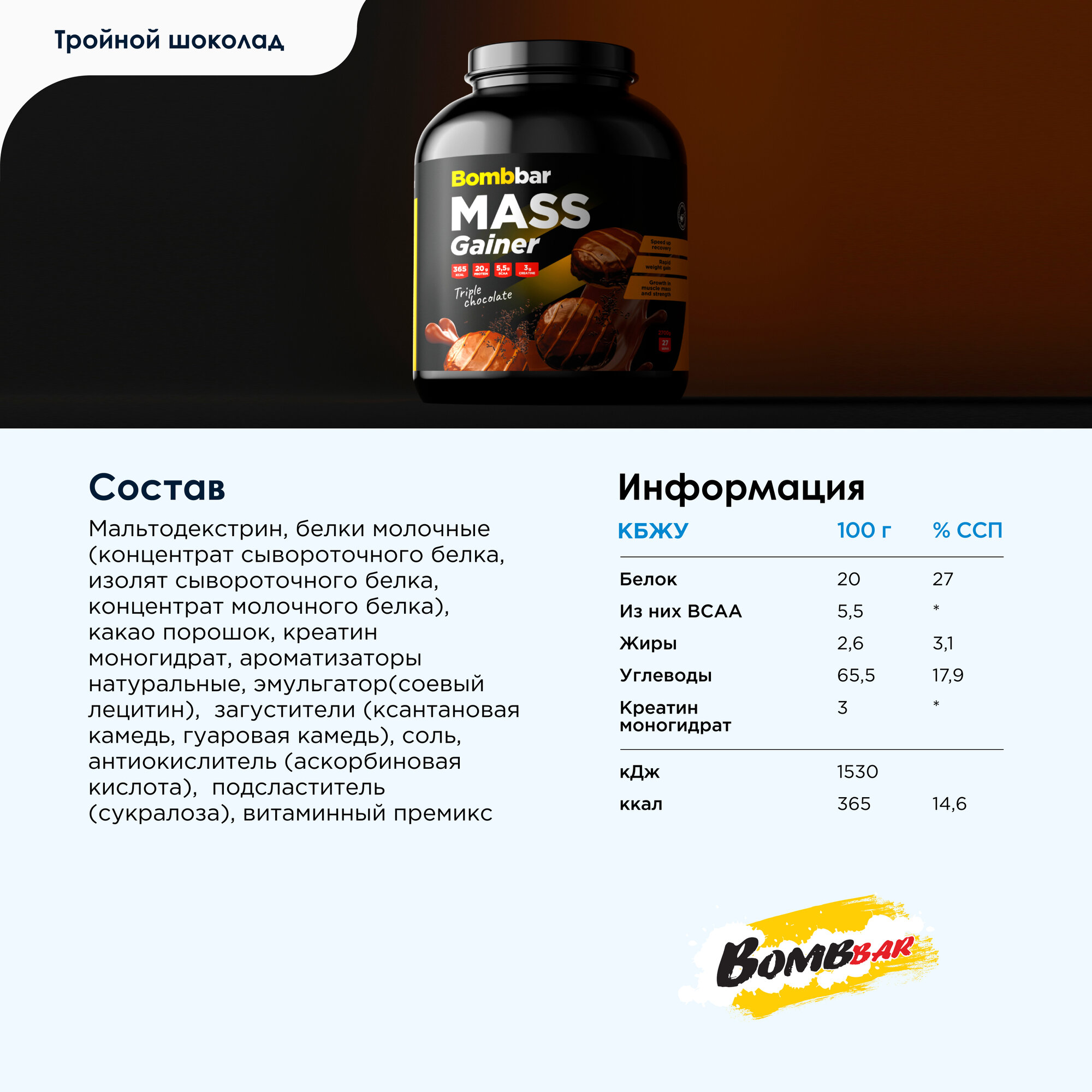 Bombbar Mass GAINER 2700 gr, 27 порции(й), тройной шоколад