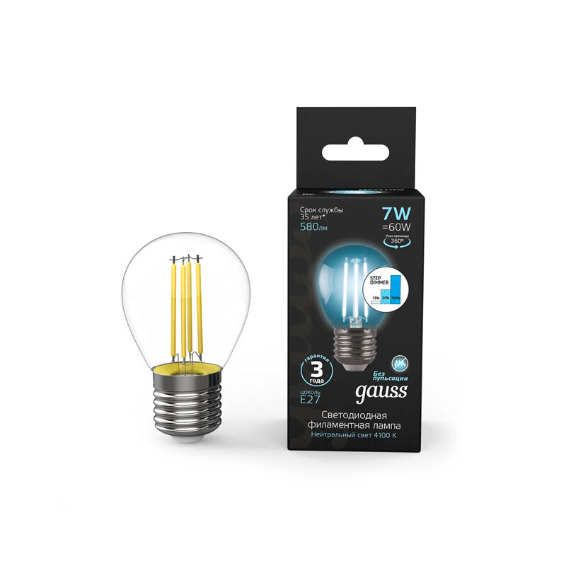 Светодиодная лампа Gauss G45 7Вт 150-265В 4100K E27 филамент.