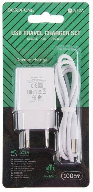 Купить Сетевое зарядное устройство Borofone BA52A, USB, 2.1 А, кабель microUSB, 1 м, белое 9088832