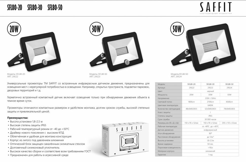 Ниже Вы можете прочитать отзывы на SAFFIT Прожектор светодиодный SFL80-50 с встроенным датчиком 2835SMD 50W 6400K AC220V/50Hz IP65, черный в компактном корпусе 29524, ознакомится с подробными характеристиками, посмотреть интересные обзоры и фотографии на SAFFIT Прожектор светодиодный SFL80-50 с встроенным датчиком 2835SMD 50W 6400K AC220V/50Hz IP65, черный в компактном корпусе 29524.