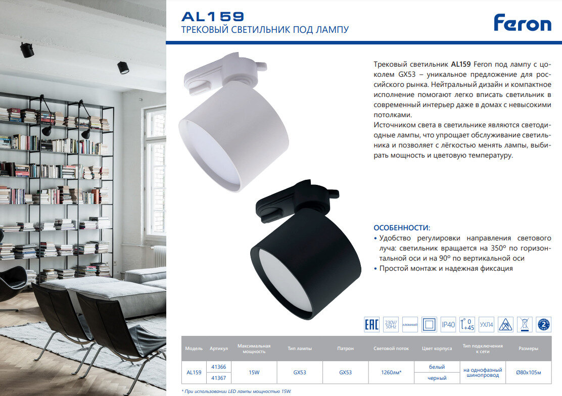 Трековый светильник Feron AL159 41367 однофазный под лампу GX53