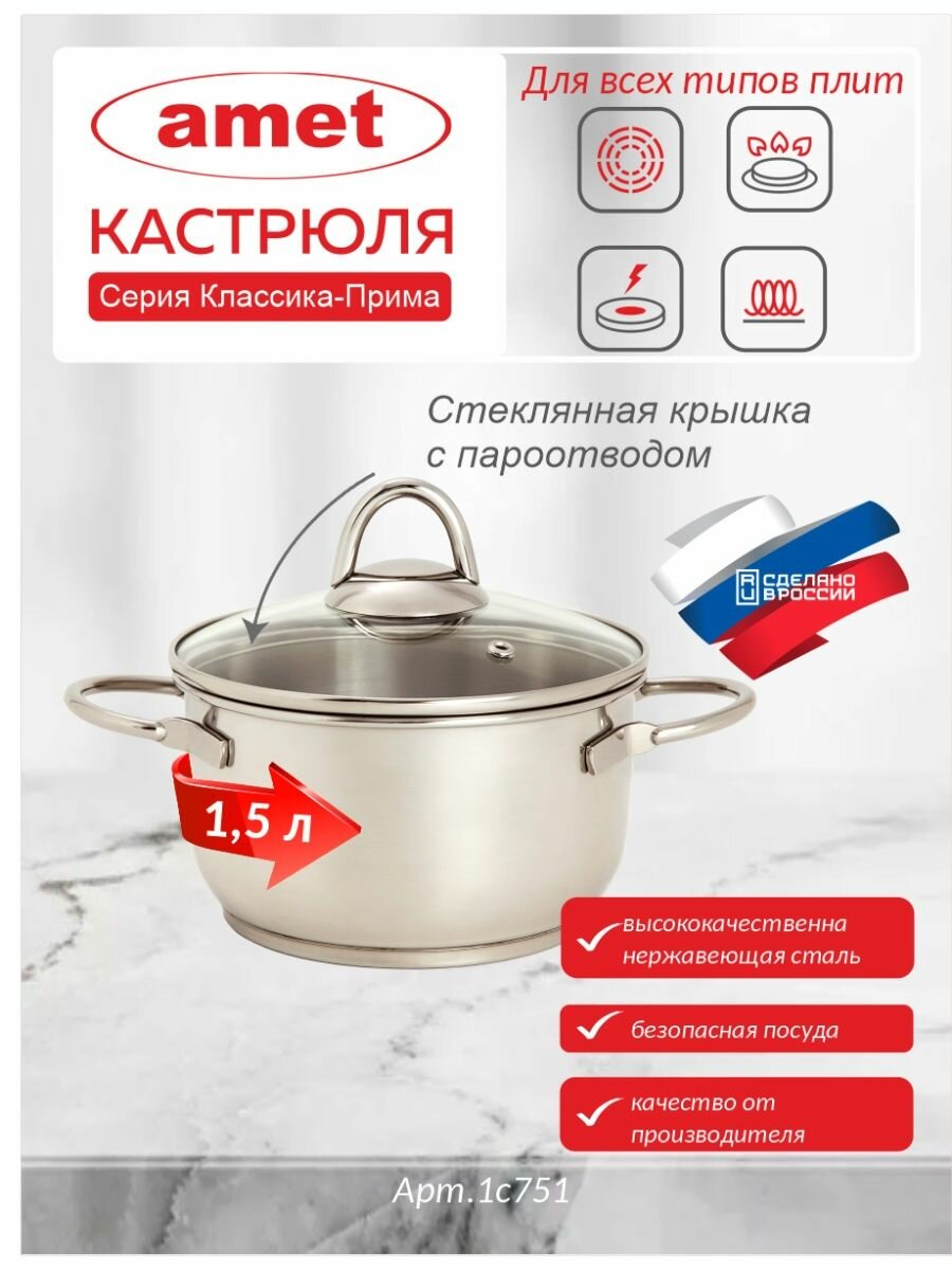 Купить Амет 1с751 Классика- Прима ТРС-3, Кастрюля 1,5л (d:160 мм, стеклянная крышка, прутковые ручки)