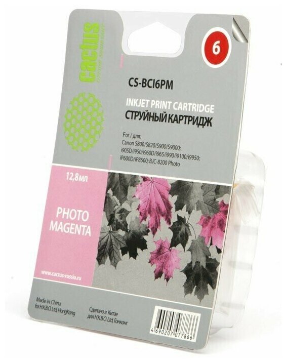 Картридж струйный Cactus CS-BCI6PM светло-пурпурный (12мл) для Canon BJC-8200/MP750/MP760/MP780/iP4000/iP5000/iP6000D/iP8500/S800/S820D/S830D/S900/S9000/i865/i905D/i9100/i950/i965/i990/i9900/i9951
