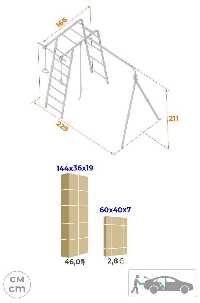 | В комплекте | гимнастические кольца, канат, качели, лестница, рукоход, турник |