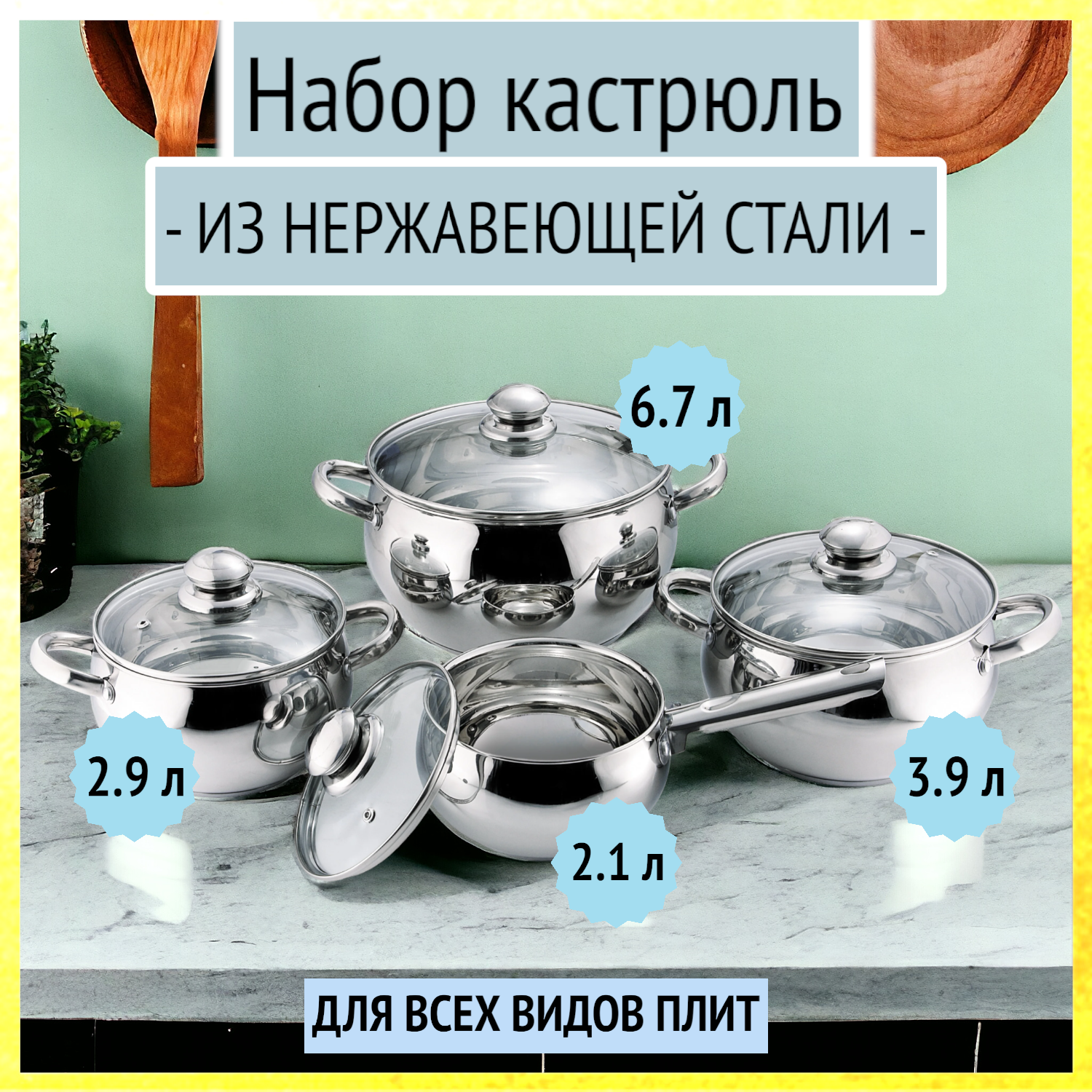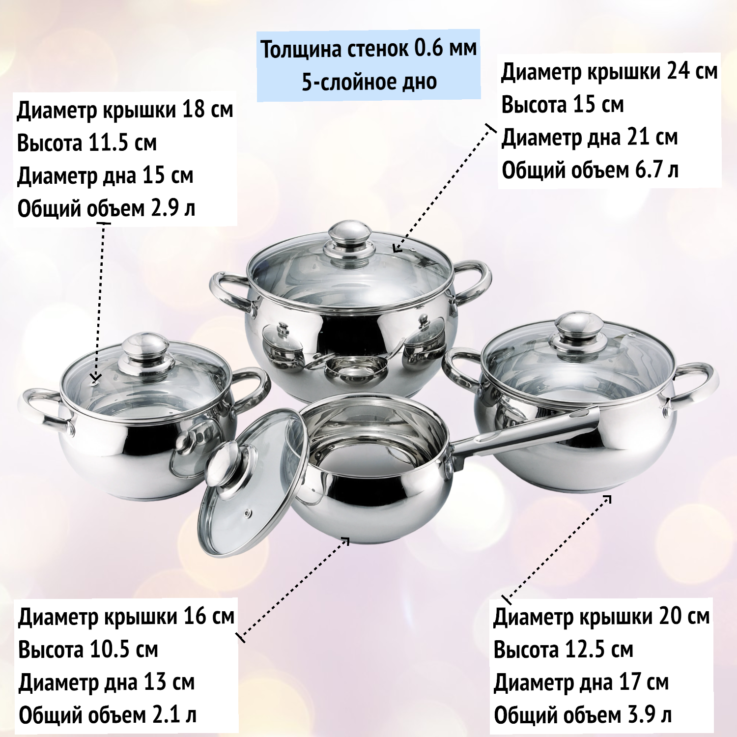 | Комплектация | кастрюли: 3 л, 4 л, 6.8 л; ковш: 2 л; 4 крышки |