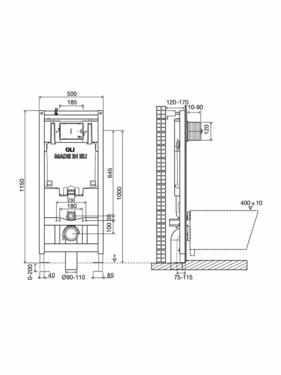 | Дополнительная информация | совместима со всеми видами подвесных унитазов; рама испытана нагрузкой 400 кг; в комплекте: крепежные элементы для унитаза, крепежные элементы для рамы, комплект соединительных патрубков для унитаза, фановый отвод для слива и переходник ø90/110, G1/2” запорный клапан |