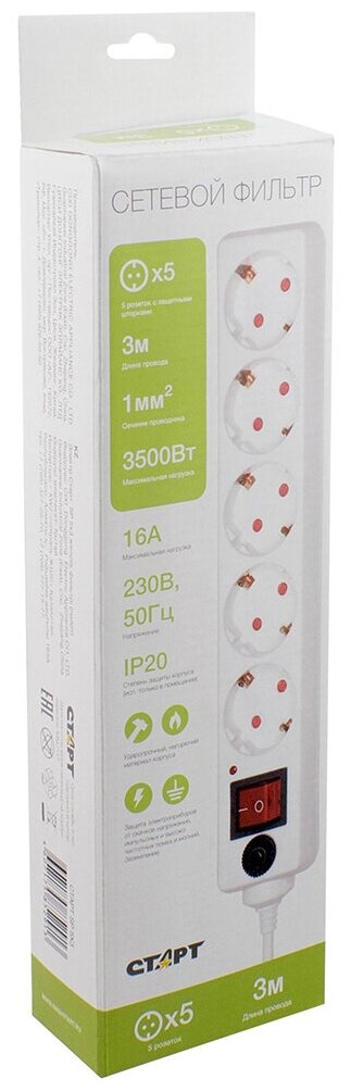 Сетевой фильтр Старт С/УД-Ф SP 5x3, 3,5 кВт, 16 А, с заземлением, с кнопкой, 5 розеток, 3 м, белый