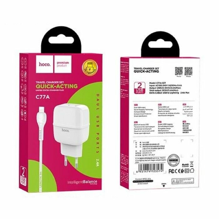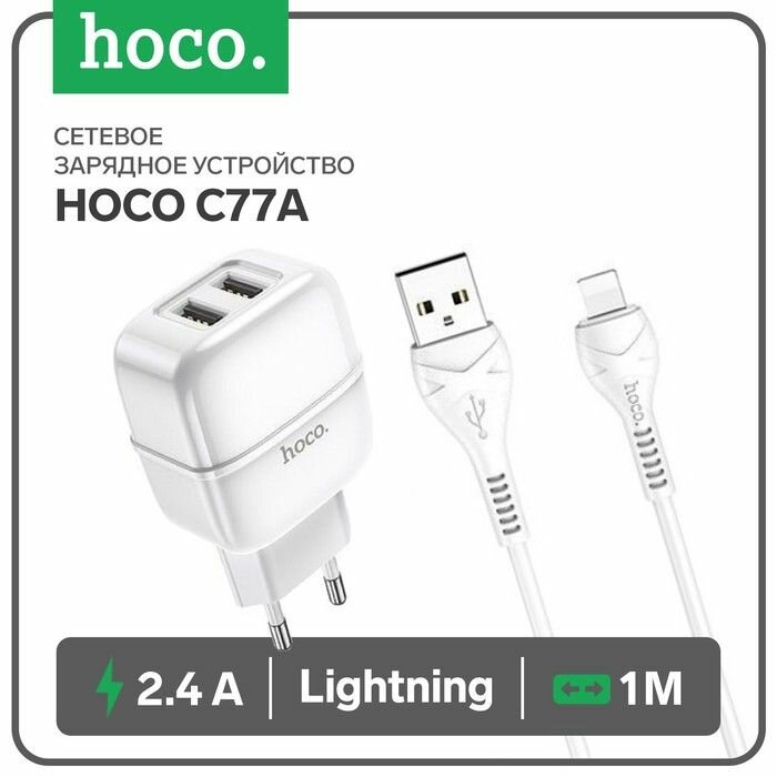 Сетевое зарядное устройство (СЗУ) Hoco C77A (2 USB) + кабель Lightning, 2.4 А, белый