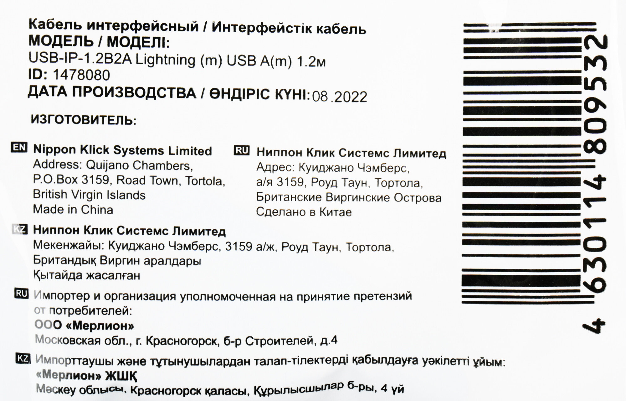 | Разъемы | USB 2.0 (am) - Lightning (m) |