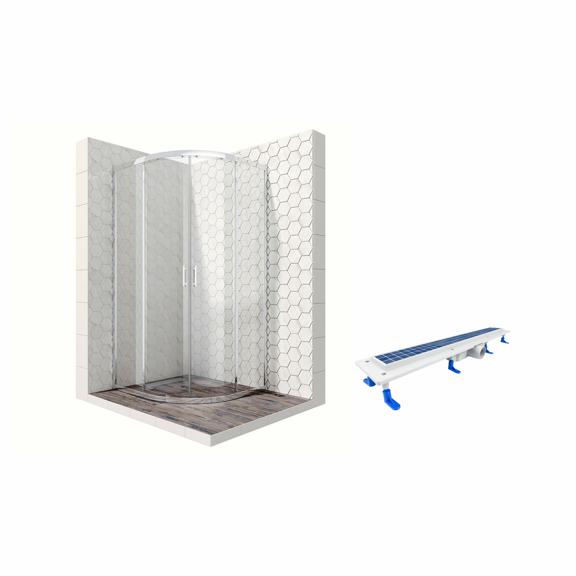 Комплект полукруглого душевого ограждения с линейным трапом Ambassador Kingston 14011104-ST12, с EasyClean, 90 х 90 см