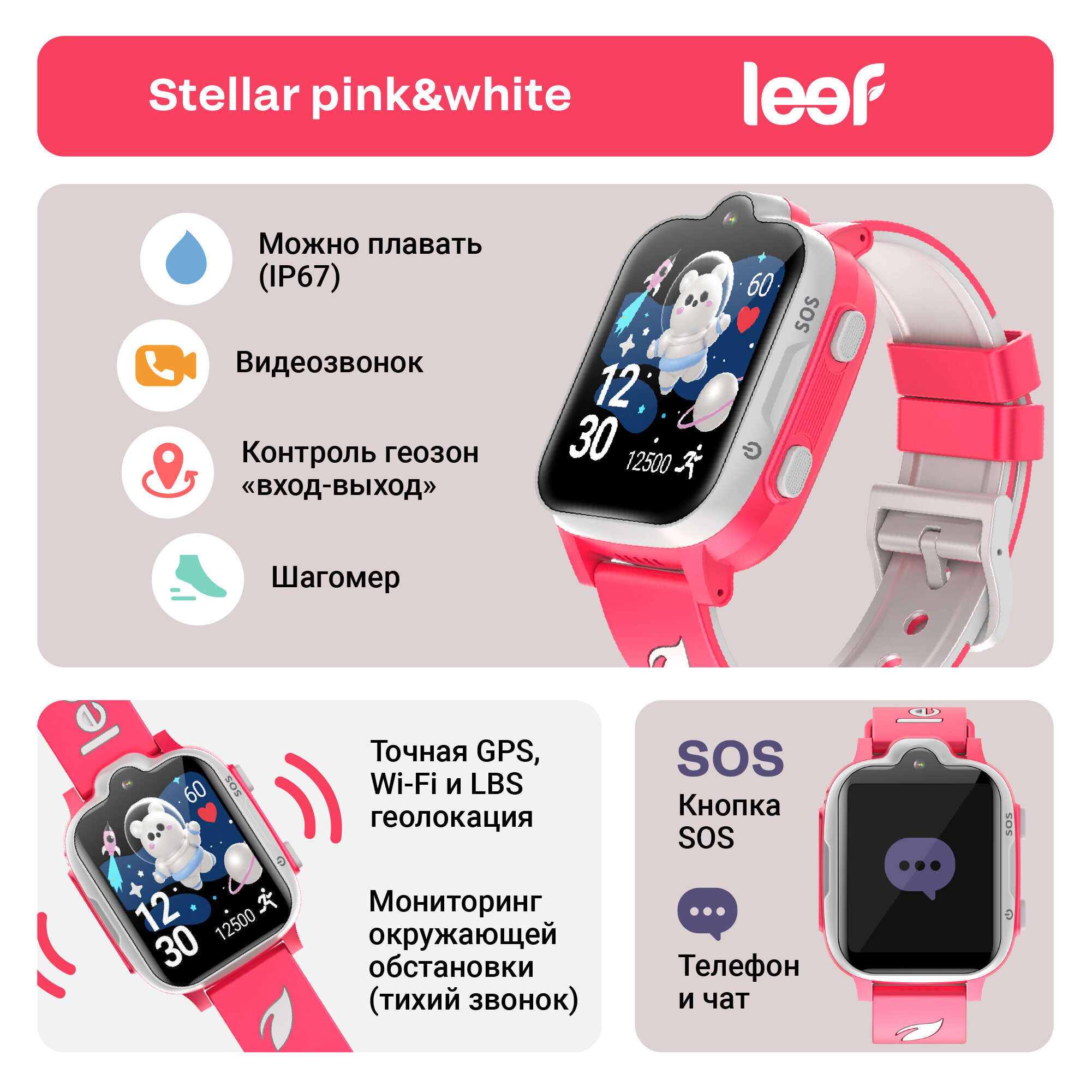 Детские умные часы LEEF Stellar, цвет розово-белый интересное:
