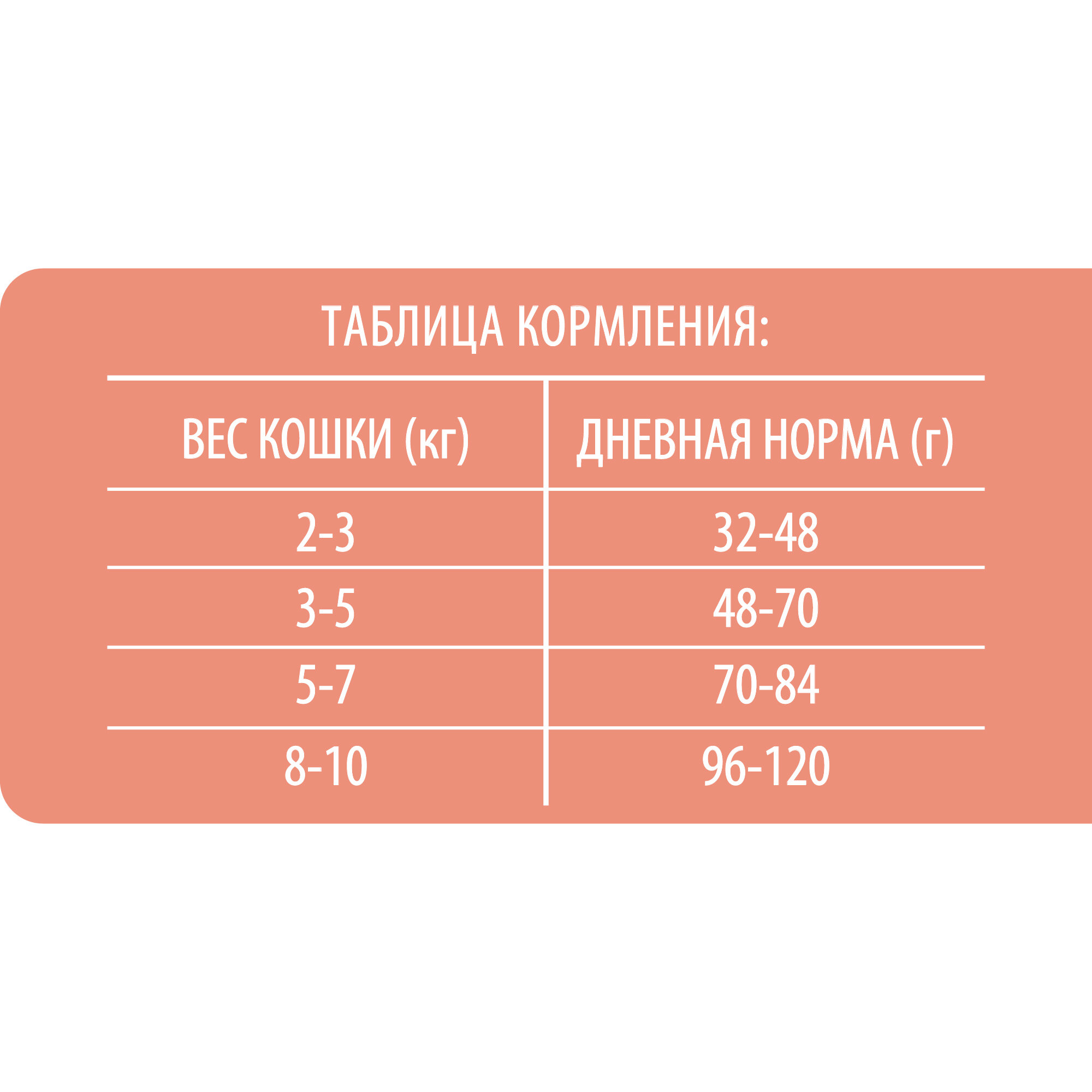 | Дополнительная информация | При вводе нового корма смешайте его небольшое количество с привычной едой и в течение нескольких дней постепенно увеличивайте количество нового корма. Следуйте рекомендациям по ежедневному питанию, представленным в таблице. Количество корма может меняться в зависимости от таких факторов, как возраст и уровень активности. |