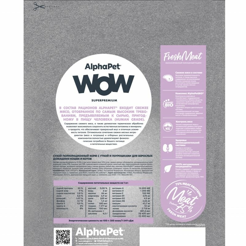 Купить Корм сухой Alphapet Superpremium WOW, с уткой и потрошками для взрослых домашних кошек и котов, 350 г