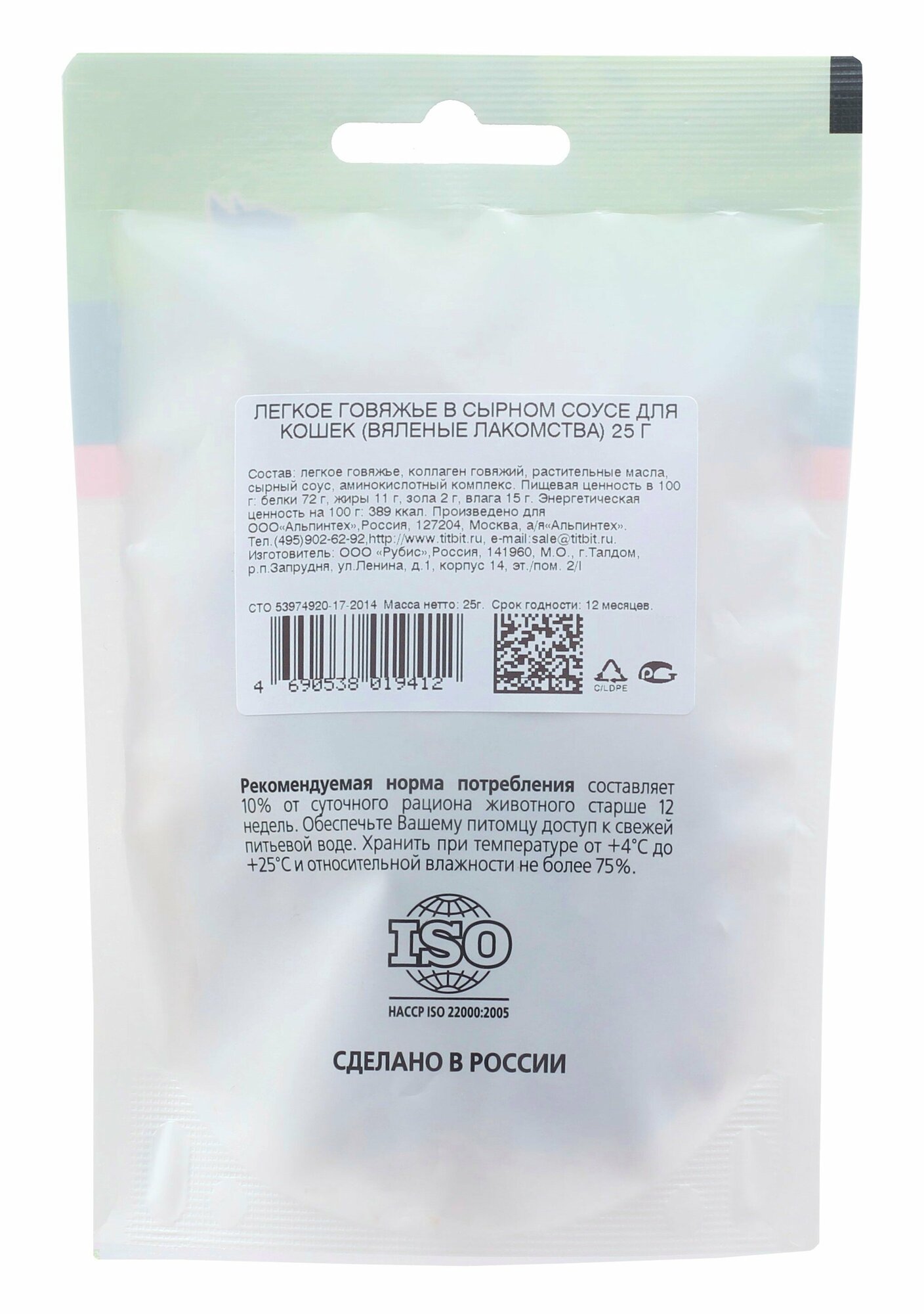 Лакомства для кошек и котят разных пород Легкое говяжье в сырном соусе / мясные вкусняшки для животных жевательные / добавка к корму / натуральное кошачье лакомство Titbit 25г