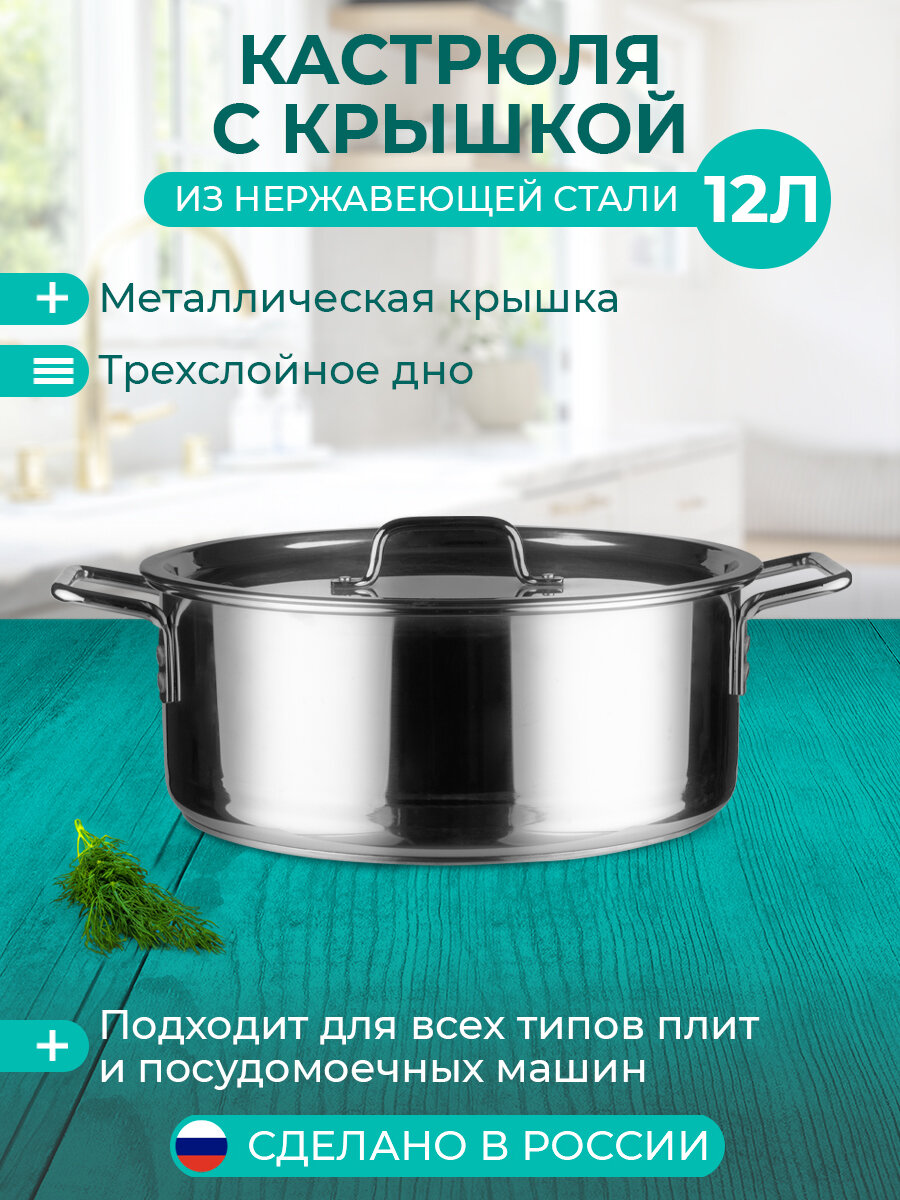 Кастрюля для приготовления из нержавеющей стали "Общепит", капсульное дно, металлическая крышка, 12 л, d=35 см
