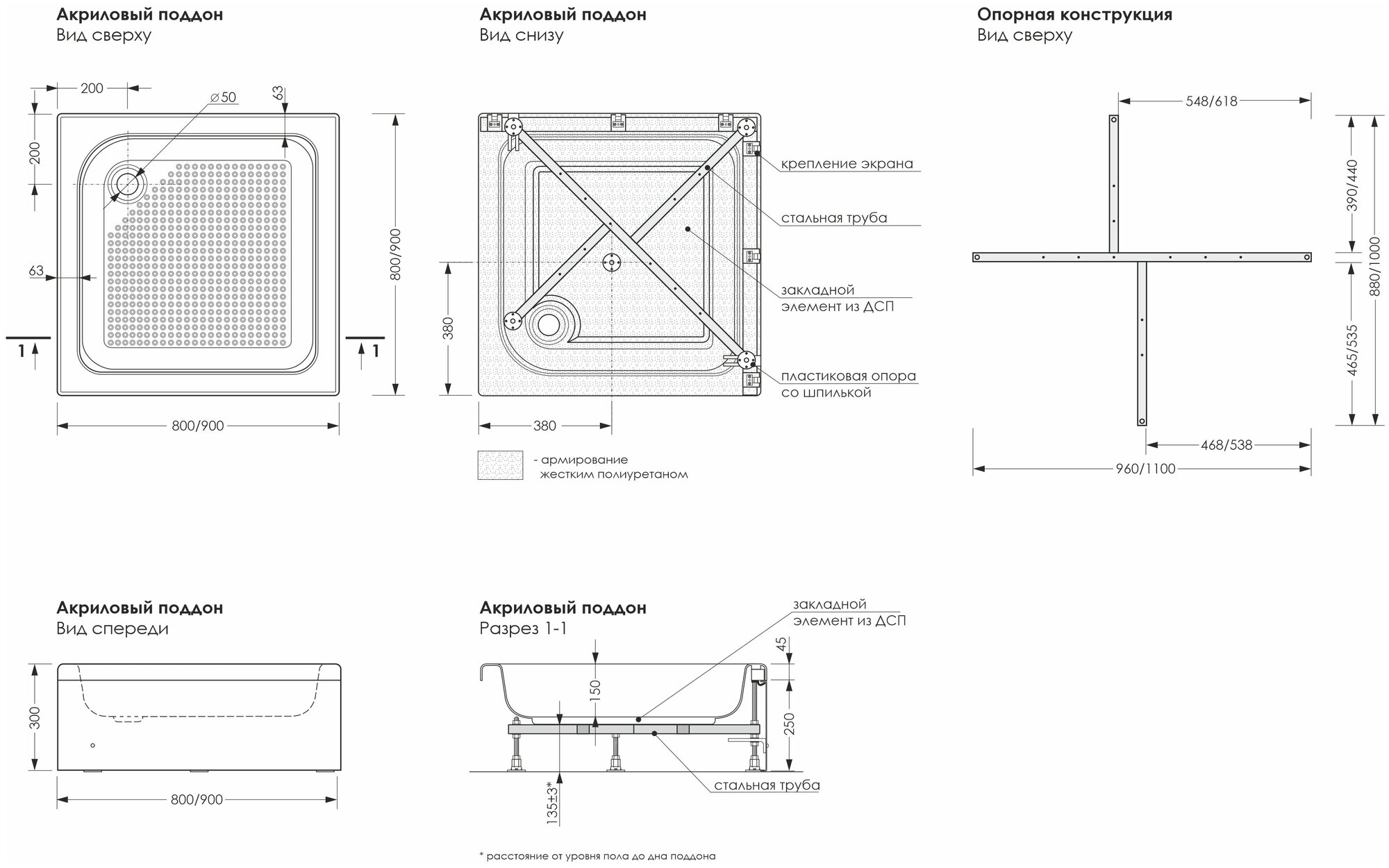 | Дополнительная информация | армирование: жёсткий полиуретан; опорная конструкция: сварной металлический каркас; вес поддона 800х800мм - 9.6 кг, вес поддона 900х900мм - 12.2 кг |
