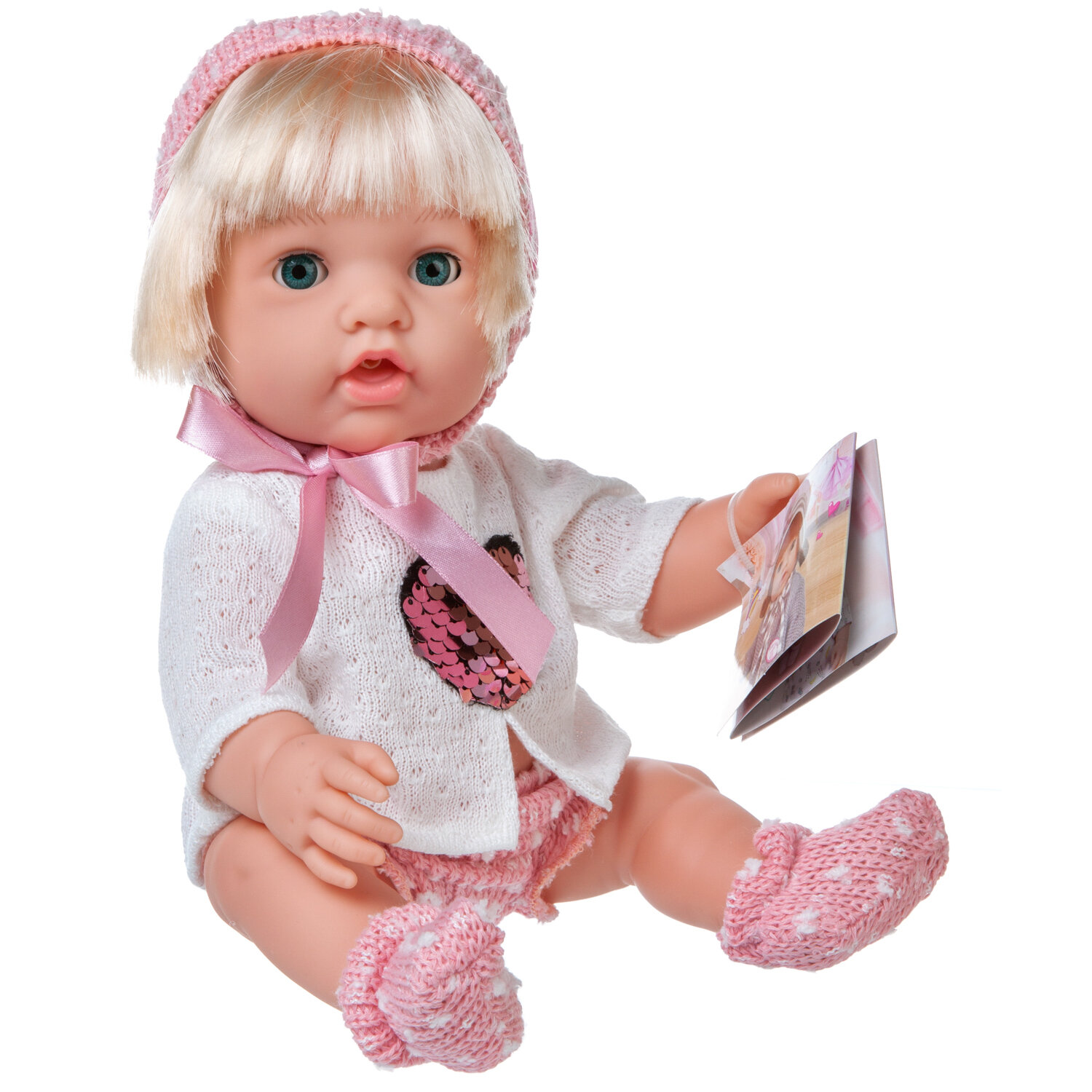 Купить Пупс Junfa "Baby Ardana", 30 см, в белой кофточке с сердечком из пайеток и ажурных шортиках, с аксессуарами, в коробке (WJ-C0052)