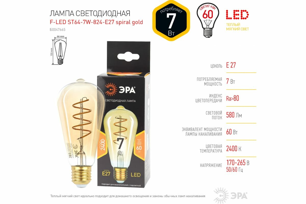 Купить Лампа F-LED ST64-7W-824-E27 spiral gold (филамент спир. зол. 7Вт тепл. E27) (20/960) Б0047665 Эра