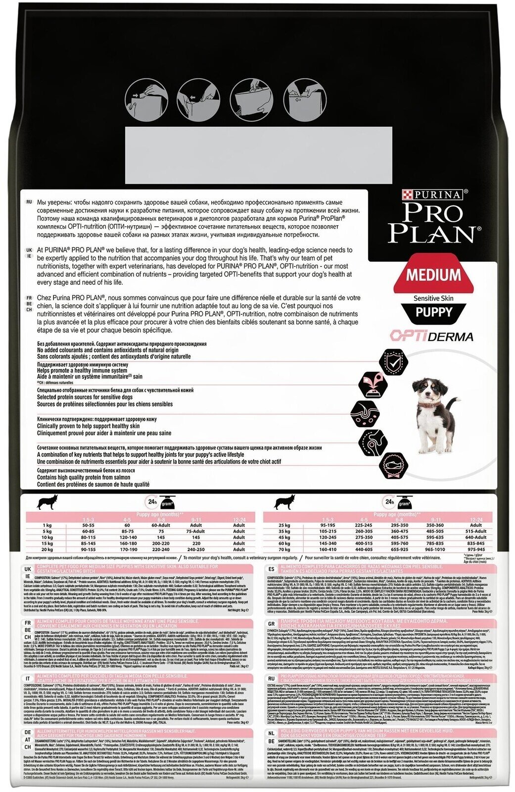 Сухой корм Pro Plan для щенков средних пород с чувствительной кожей с комплексом OPTIDERMA® с лососем и рисом, Пакет, 12 кг,Для щенков