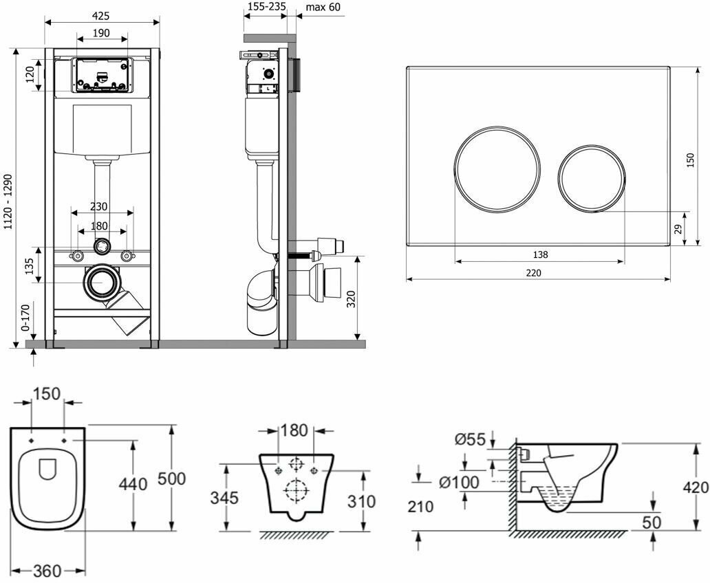 Подвесной унитаз комплект 6 в 1 Lavinia Boho Bristol Rimless 75110220: унитаз, сиденье микролифт, инсталляция, кнопка, шумоизоляция